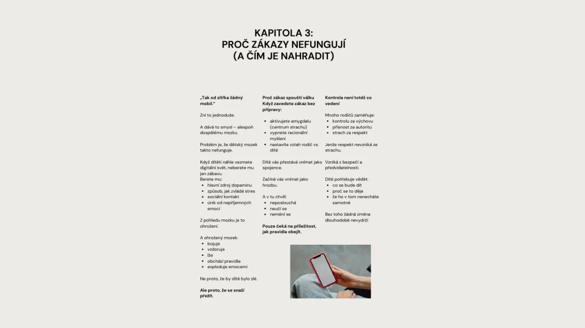 Klasické aplikace typu „rodičovská kontrola“ vytvářejí vztah policajt–zloděj. Děti jsou v technologiích vždy o krok napřed a naučí se zákazy obcházet, což jen ničí vaši vzájemnou důvěru. Náš e-book nejde cestou softwarových zámků, ale psychologického a biologického restartu. Neřešíme následek (zapnutý mobil), ale příčinu (potřebu úniku a dopaminovou závislost).